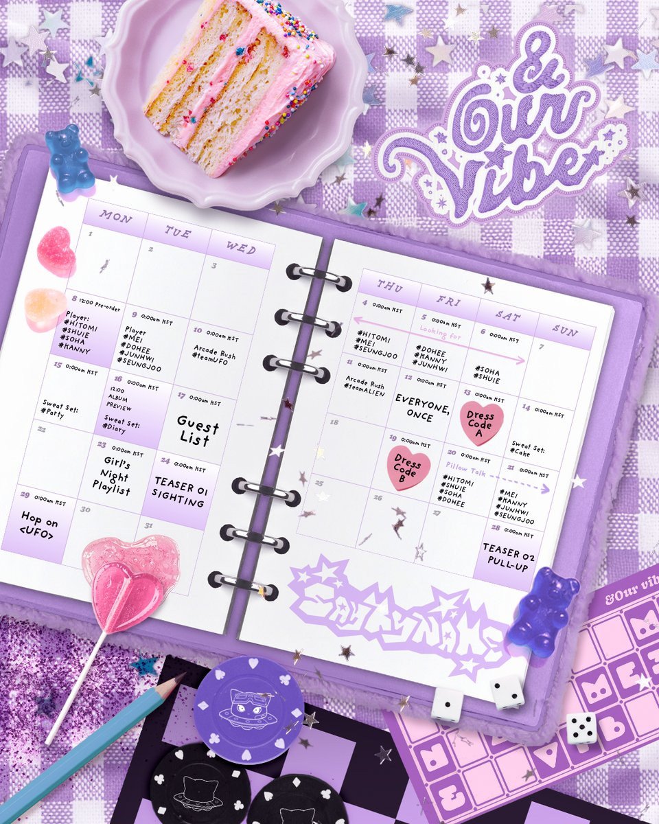 韓國時間12月3日凌晨,SAY MY NAME 公開了她們第三張迷你專輯《& Our Vibe》的行程表。女孩們釋出了一張預告,展示了一個可愛的紫色計劃本,上面標註了預告內容的發布日期。