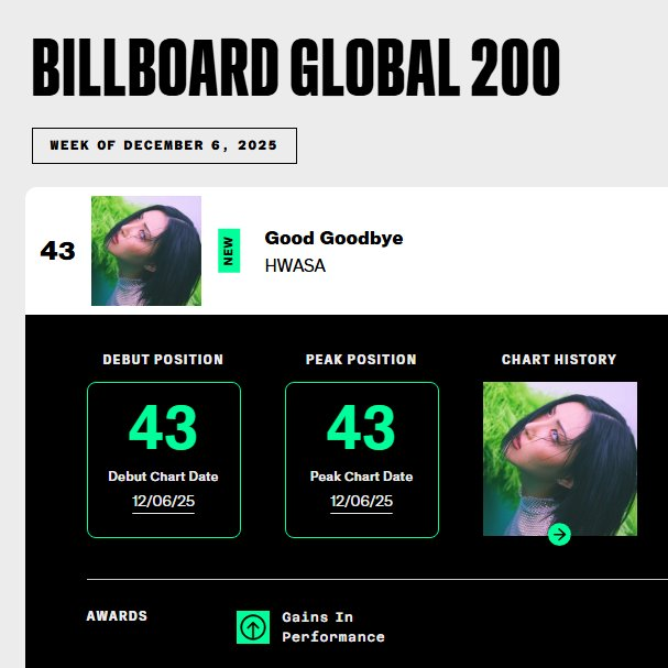 本週,她首次登上Billboard三大主要榜單(HOT100、Billboard 200和Billboard Global 200)之一的Billboard Global 200,位列第43名。在沒有任何西方宣傳、歌曲主要以韓語為主的情況下達成此成就,更加證明了她作為Solo歌手在業界的存在感。