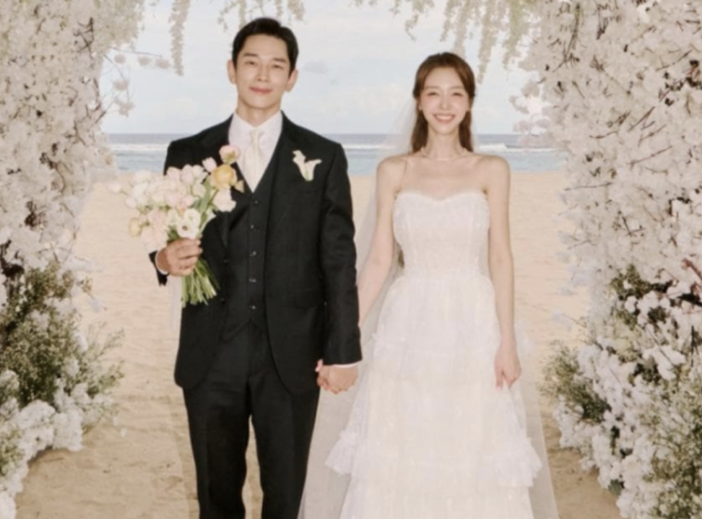 珉雅身穿飾有蕾絲細節的白色婚紗,散發優雅與溫婉氣質;安宰賢則以經典黑色西裝展現沉穩的新郎魅力。
