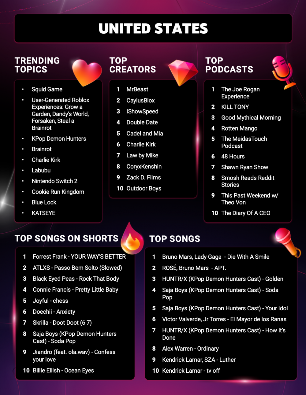 在美國,源自K-Pop的熱門話題包括「魷魚遊戲」、「K-POP獵魔者」及KATSEYE。Saja Boys的歌曲「Soda Pop」在Shorts熱門歌曲榜中位列第8,並在總熱門歌曲榜中排名第4;此外,多首《K-POP獵魔者》原聲帶如「Golden」、「Your Idol」及「How It's Done」亦佔據熱門歌曲榜多個位置。當然,2025年也是Rosé與Bruno Mars的年份,他們的合作曲「APT.」在熱門歌曲榜中高居第2位。