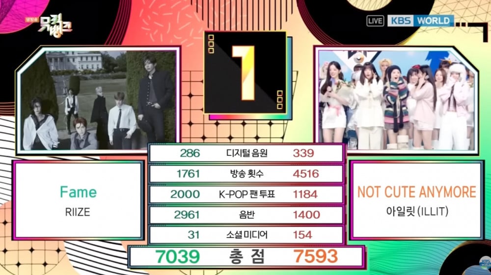 在12月5日播出的 KBS 2TV《Music Bank》中,一位候補是 RIIZE 的 《Fame》 和 ILLIT 的 《NOT CUTE ANYMORE》。最終,ILLIT 以總分7,593分成功奪得冠軍,為她們的回歸宣傳活動立下了一個意義非凡的里程碑。