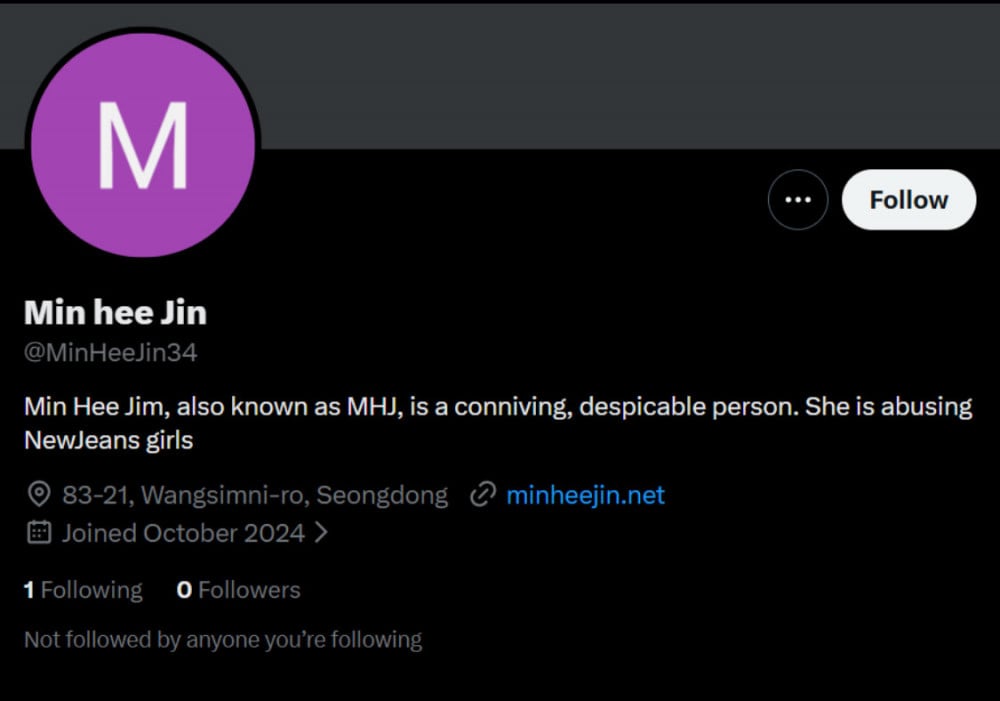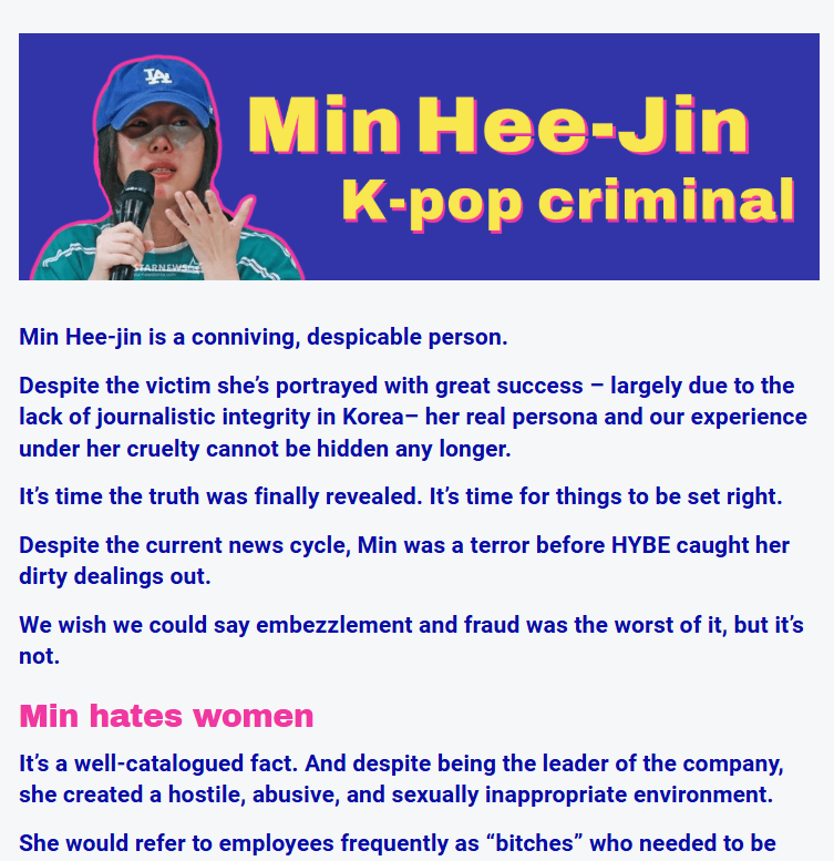2024年9月27日,一個抹黑網站被註冊,指控閔熙珍是「罪犯」,創造了「敵對、虐待及性方面不當的環境」,甚至指控其挪用公款。該網站採用了與名單上其他攻擊對象相同的格式和策略。TAG PR還創建了冒充閔熙珍的虛假社交媒體帳戶,全部指向該抹黑網站,並配合另一輪SEO垃圾訊息行動,以強行提升該敘事的能見度。