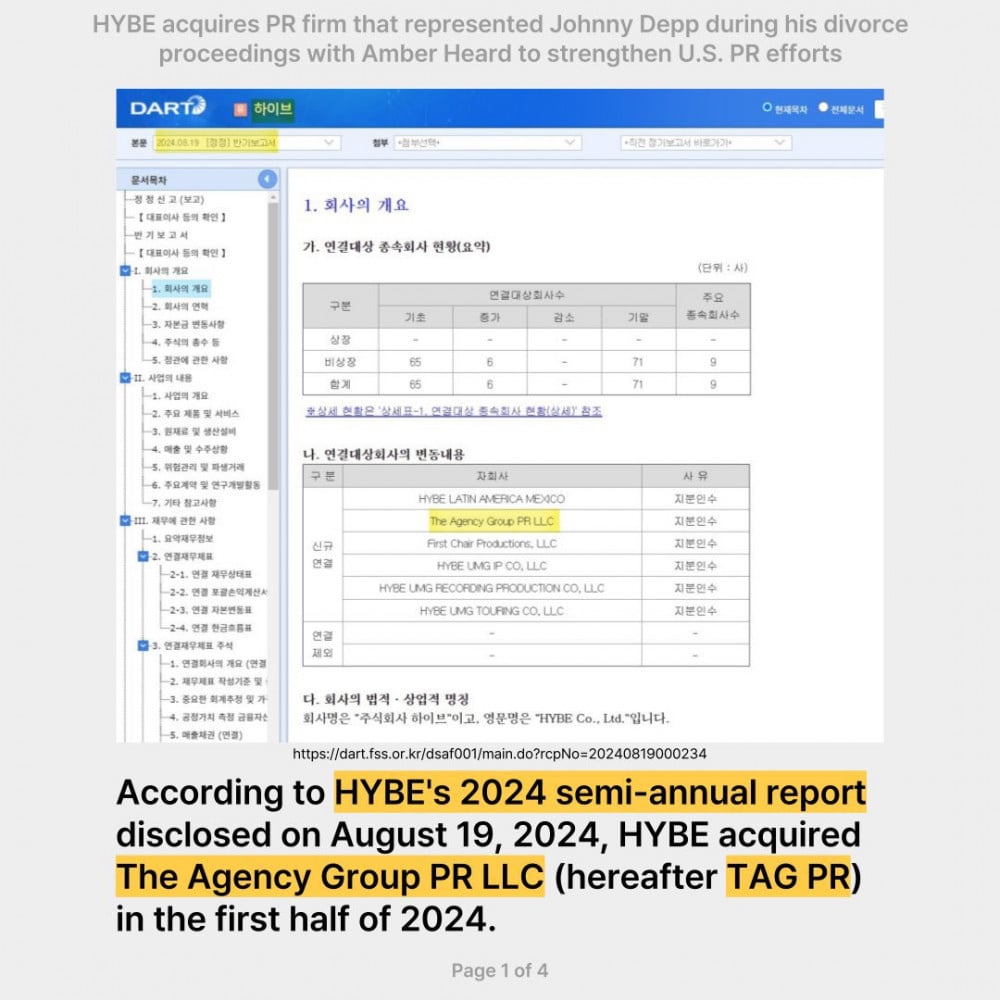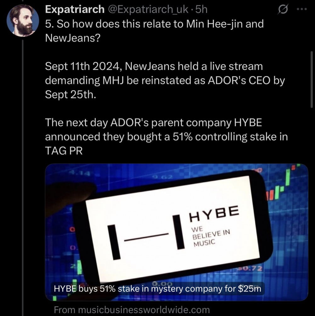 Hybe在針對閔熙珍的抹黑行動開始前,已購入TAG PR 51%的股份。隨後,針對K-pop女團NewJeans的一連串攻擊接踵而至。HYBE其後在上季度靜悄悄地拋售了所有持股。