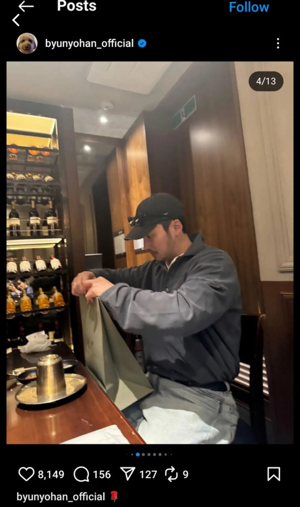 就在今年五月左右,卞約漢分享了一些他慶祝生日的照片。在其中一張照片中,粉絲們很快注意到酒架後方的鏡子裡映出了一名女子的身影。