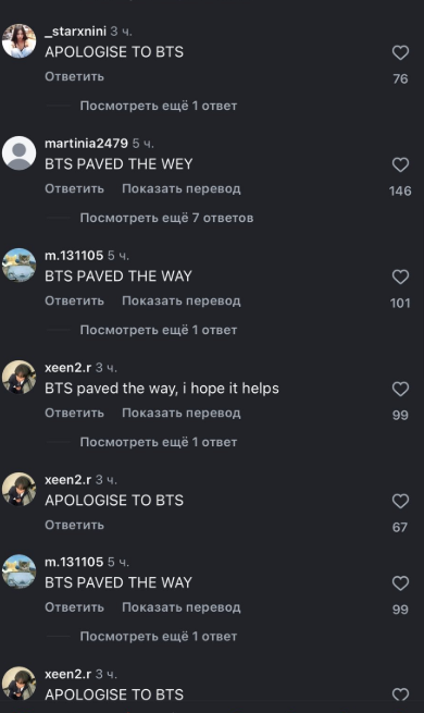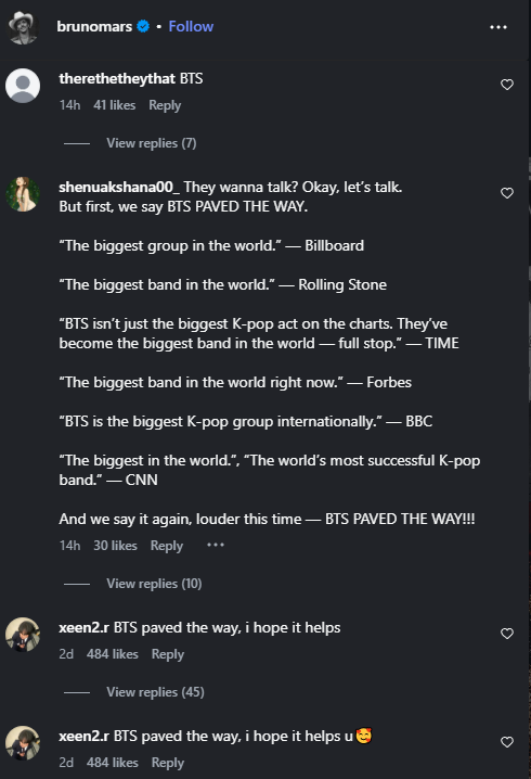 除了這些反彈,許多粉絲開始鼓勵其他人在Spotify上封鎖Bruno Mars,不再聽他的音樂。Bruno的社交媒體湧入了來自BTS粉絲的憤怒評論,反覆強調「BTS鋪平了道路」,並要求Bruno為他的言論道歉。