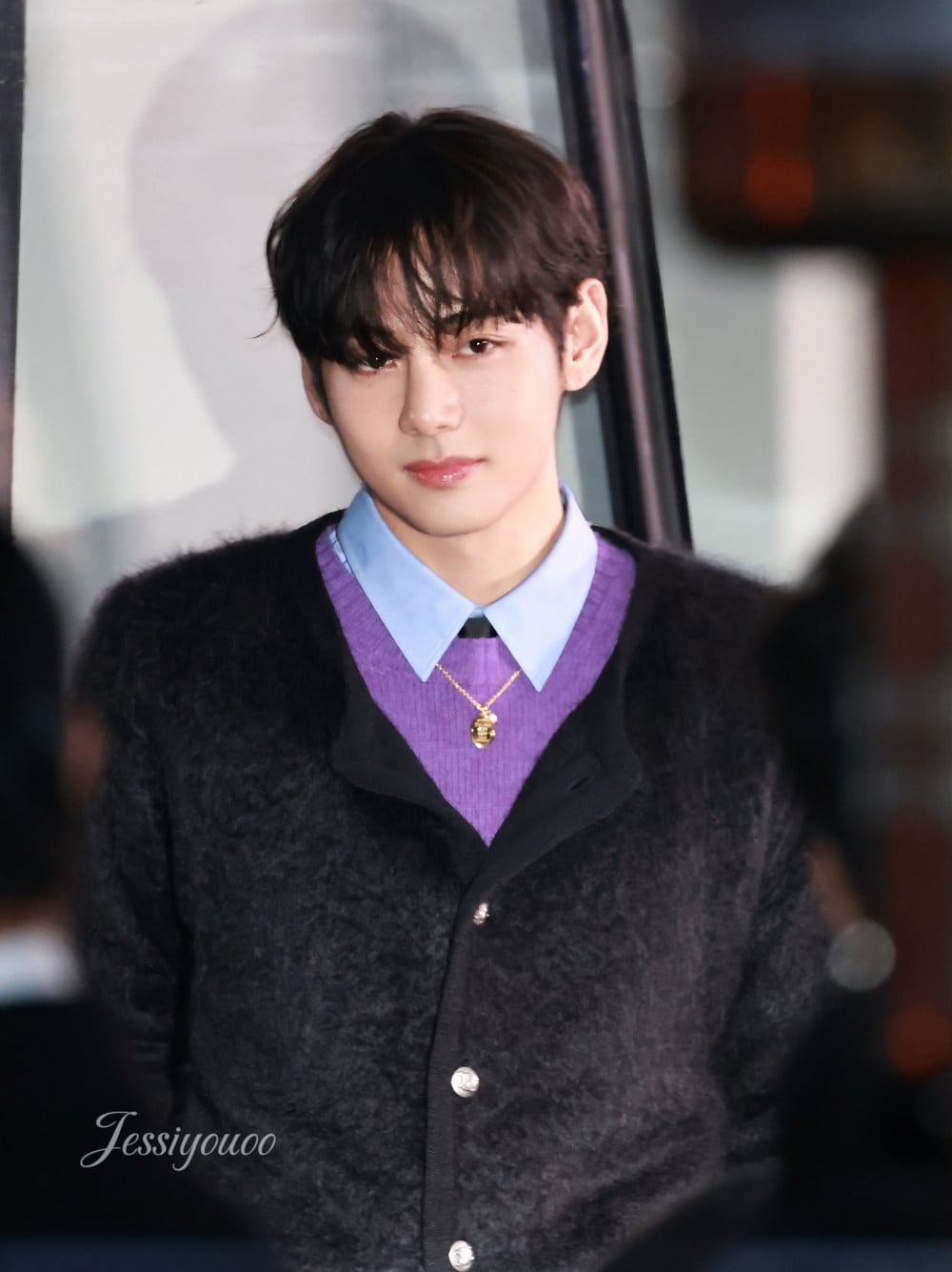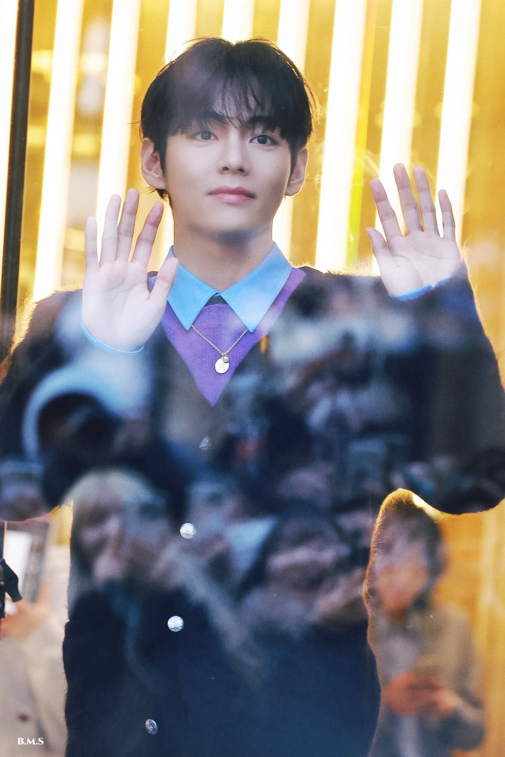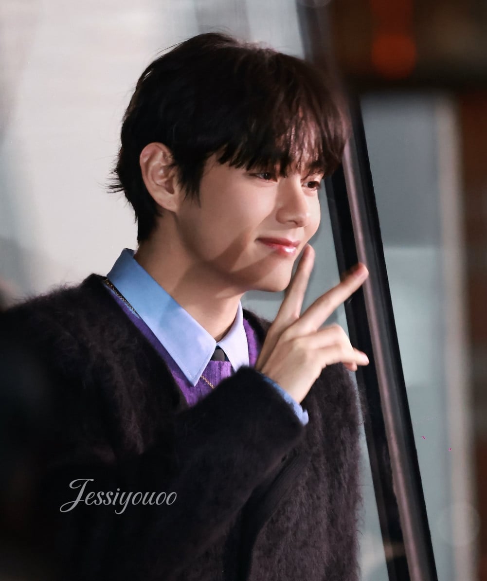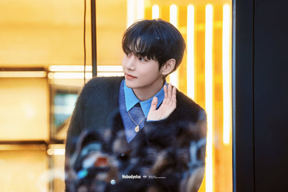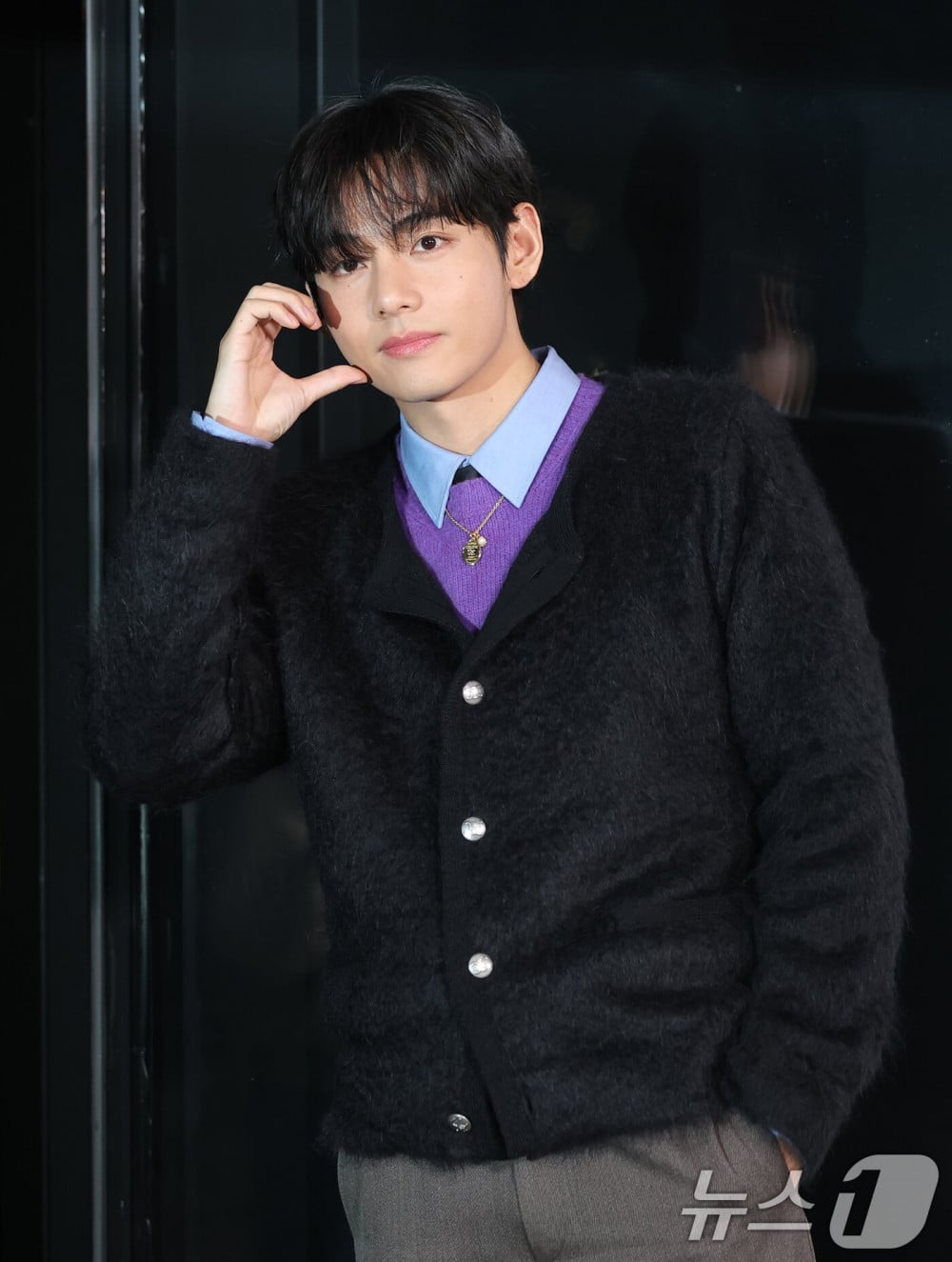 為配合場合,V展示了精緻的造型。他身穿冰藍色棉質襯衫,外搭紫色羊毛圓領毛衣,配以黑色刷毛馬海毛開襟衫及闊腿褲。他以金色樹脂珍珠與黃銅項鍊點綴整體造型,完美體現了CELINE的優雅美學。