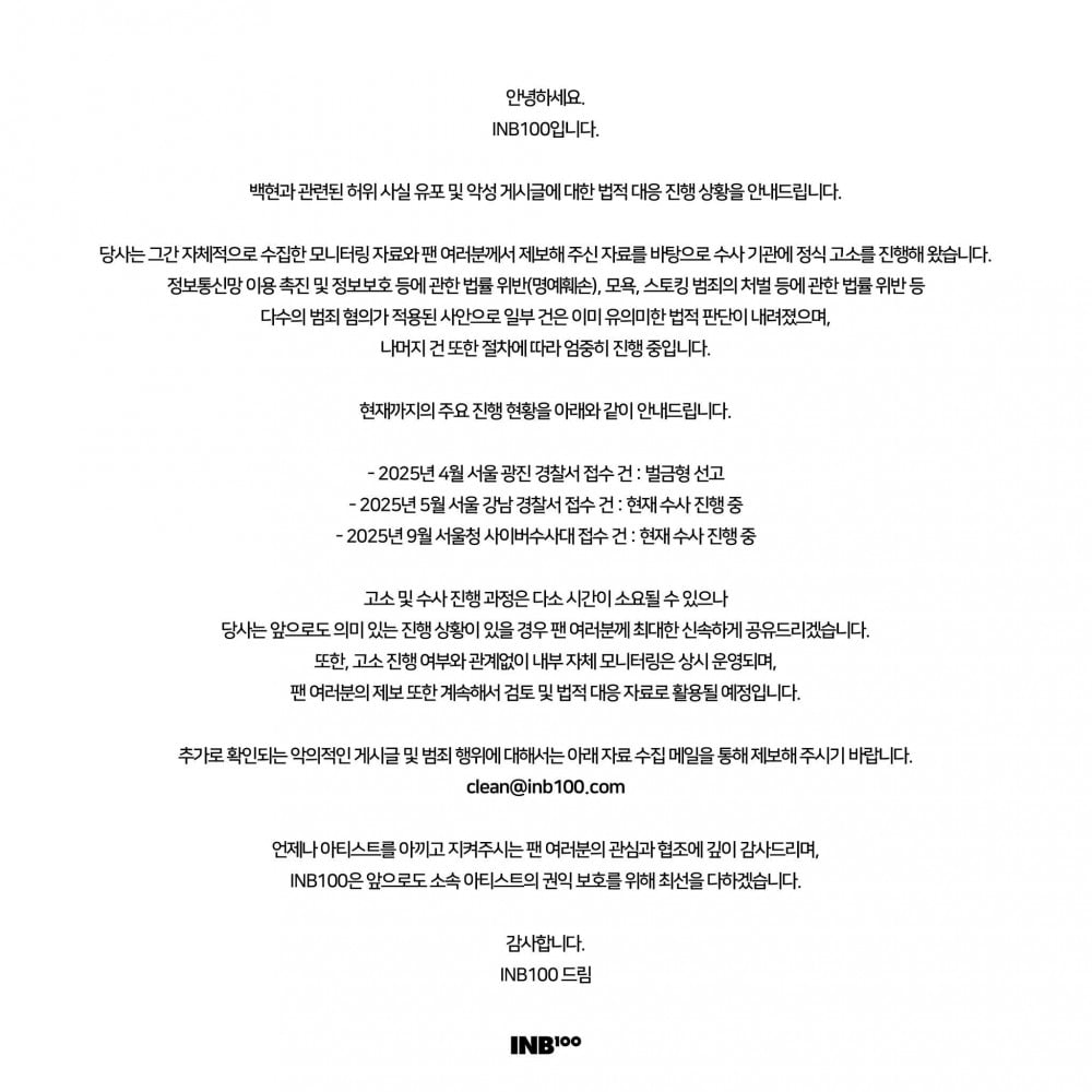 12月18日,伯賢所屬公司INB100發布官方聲明,向粉絲更新其持續進行的法律行動進展。公司表示:「我們想告知各位關於針對與伯賢相關的虛假資訊及惡意帖文傳播所採取的法律應對進展。」並補充道:「部分案件已作出具意義的法律判決。」