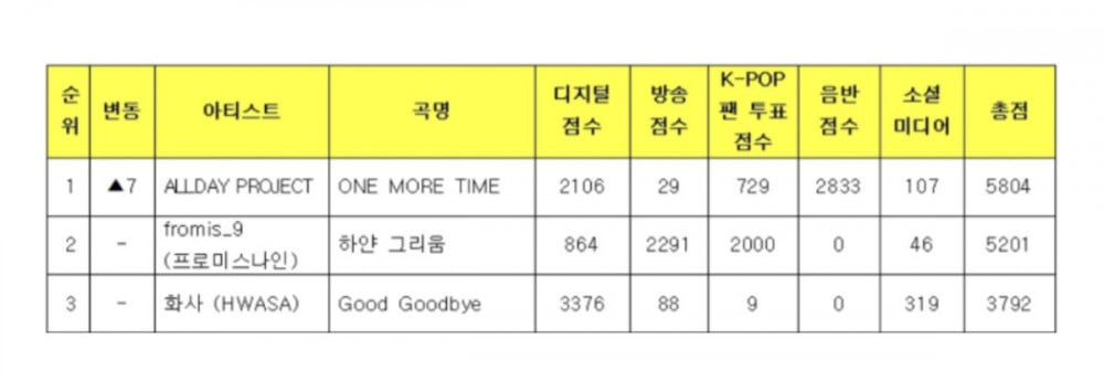 fromis_9 以〈White Memories〉獲得5,201分,排名第二;而MAMAMOO成員華莎則以〈Good Goodbye〉獲得3,792分,位居第三。