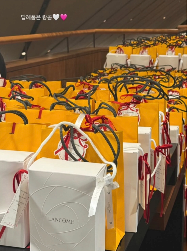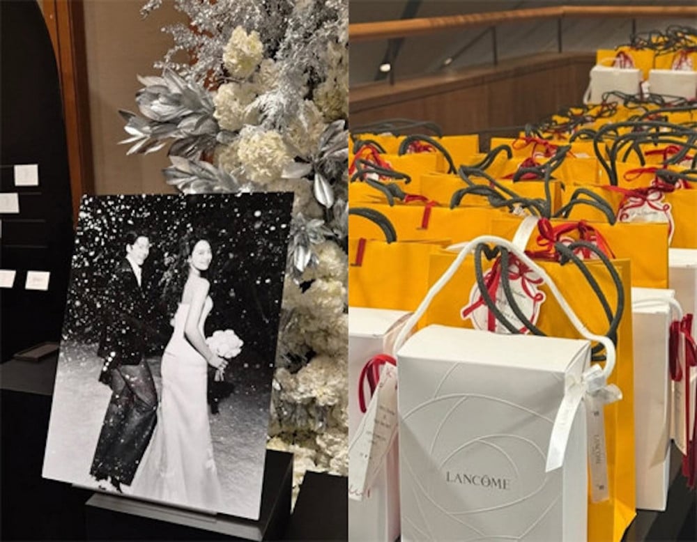 菜單卡上印有新人親手繪製的插畫及手寫訊息,充滿真摯情感。謝禮方面,賓客獲贈申敏兒現任代言品牌蘭蔻的產品,以及帕爾瑪之水的精選商品。每份禮物均附上寫有「感謝您與我們共享這珍貴時刻」的卡片,讓賓客深深感受到新人的誠意。