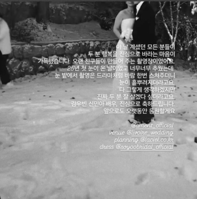 負責婚紗照的工作室亦分享了拍攝花絮。公司透露照片攝於雪景場地,並公開了金宇彬與申敏兒並肩拍攝的影片。雖然未清晰展示面容,但粉絲們仍為能在如此浪漫場景中窺見兩人身影而欣喜。