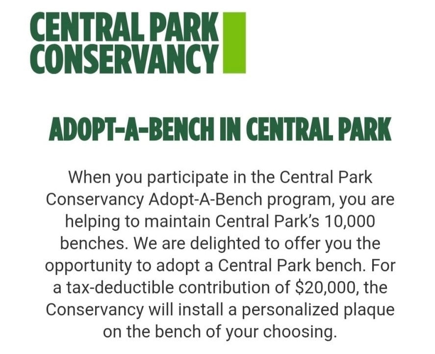 根據中央公園管理委員會的資料,參與「認養長椅」計劃有助於維護公園內約10,000張長椅。捐款20,000美元,捐贈者即可在管理委員會選定的長椅上安裝個性化銘牌。