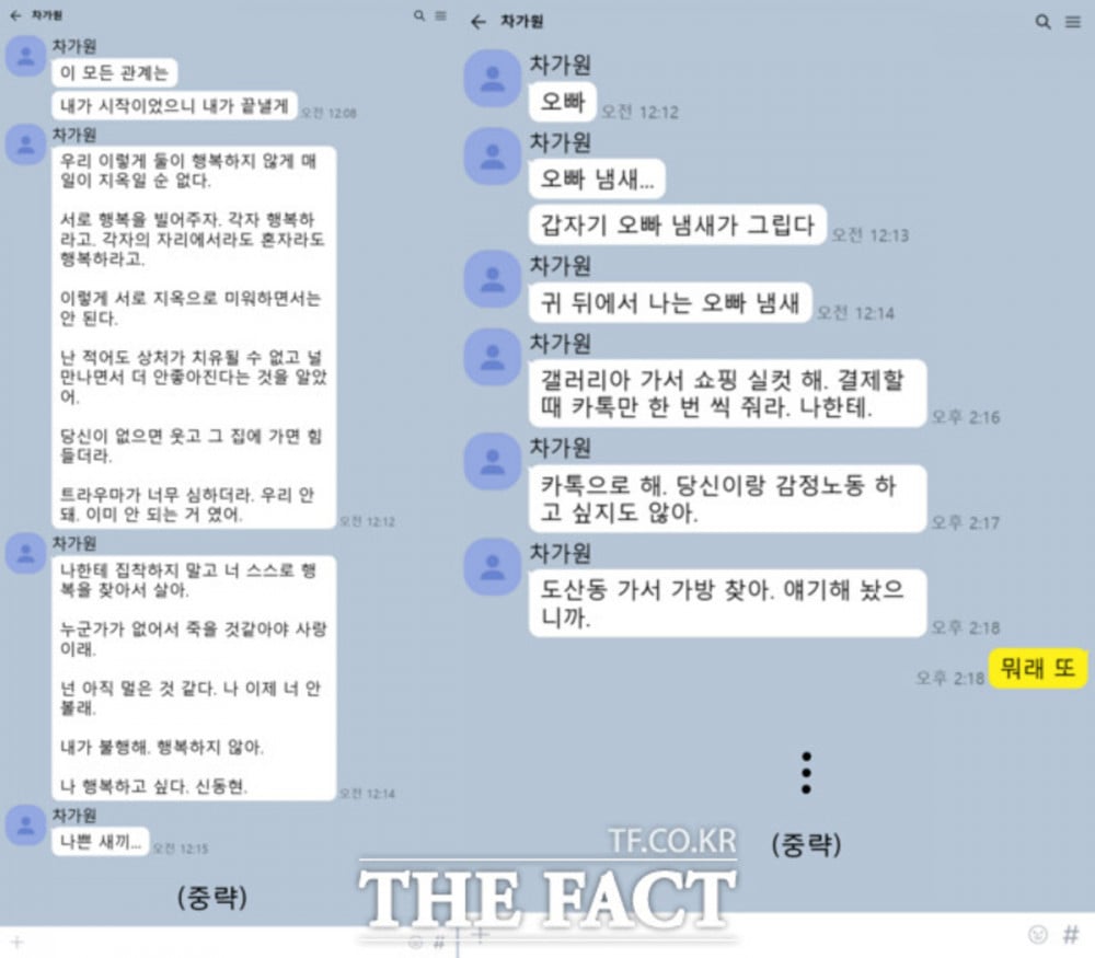 她補充道:「別纏著我。去找你自己的幸福。愛是感覺沒有對方會死。你還沒到那個地步。我不會再見你了。我不快樂。我想快樂。申東泫。」