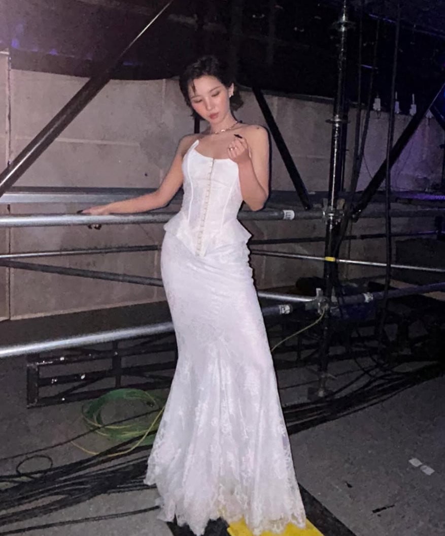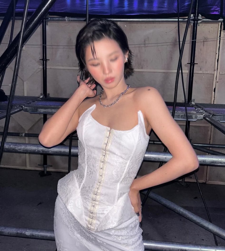 Soyeon 最近在她的社交媒體上分享了幾張後台照片。在照片中,她身穿一件白色無袖連身裙,擺出輕鬆的姿勢。這件連身裙自然地突顯了她的鎖骨和肩線,而其簡約的設計則強調了她的身形輪廓,引人注目。