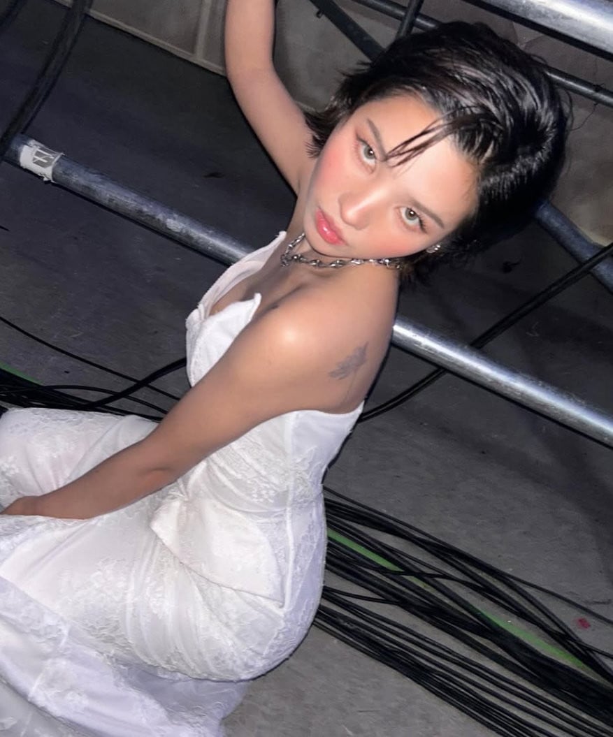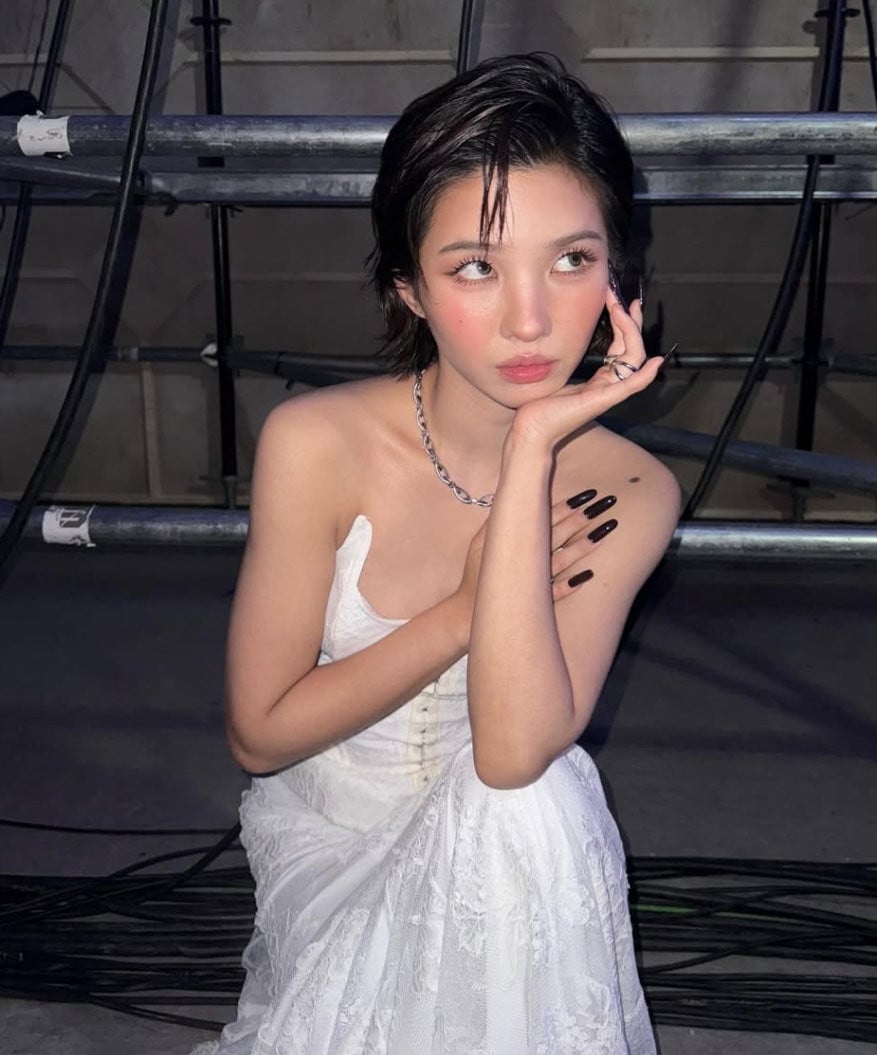 她的短髮造型和自然妝容進一步提升了 Soyeon 標誌性的精緻氛圍。她閉上雙眼,臉上帶著溫柔的微笑,展現出一種與她在舞台上強大的魅力形成對比的柔和吸引力。簡單的鏈條項鍊和極簡風格的配飾完善了整體造型,提升了整體的時尚感。