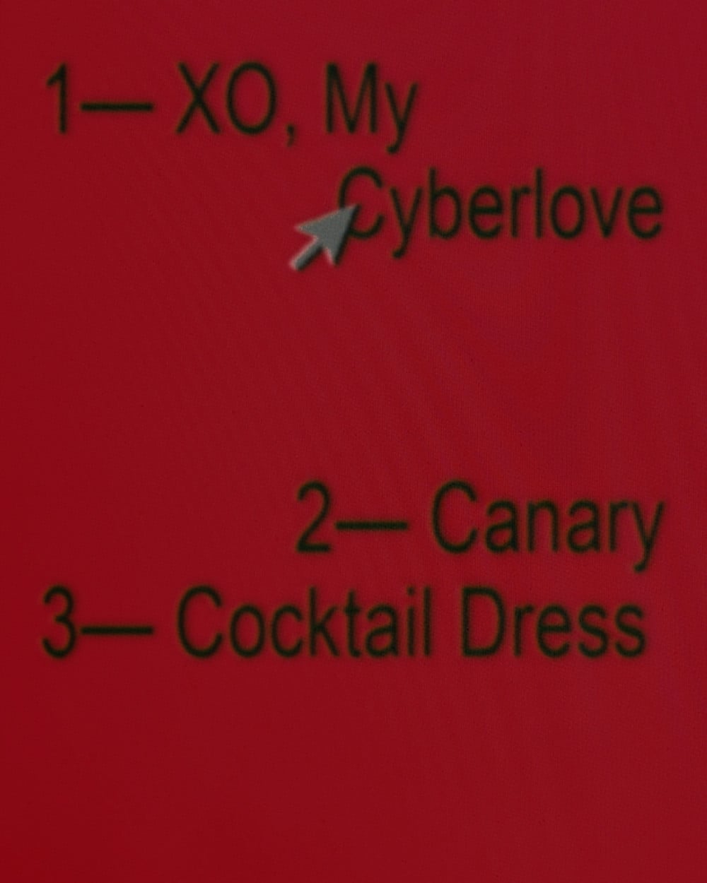預告呈現出電腦螢幕的樣貌。在醒目的紅色背景上,以黑色打字機風格的字體,列出了暗示歌曲名稱的清單。