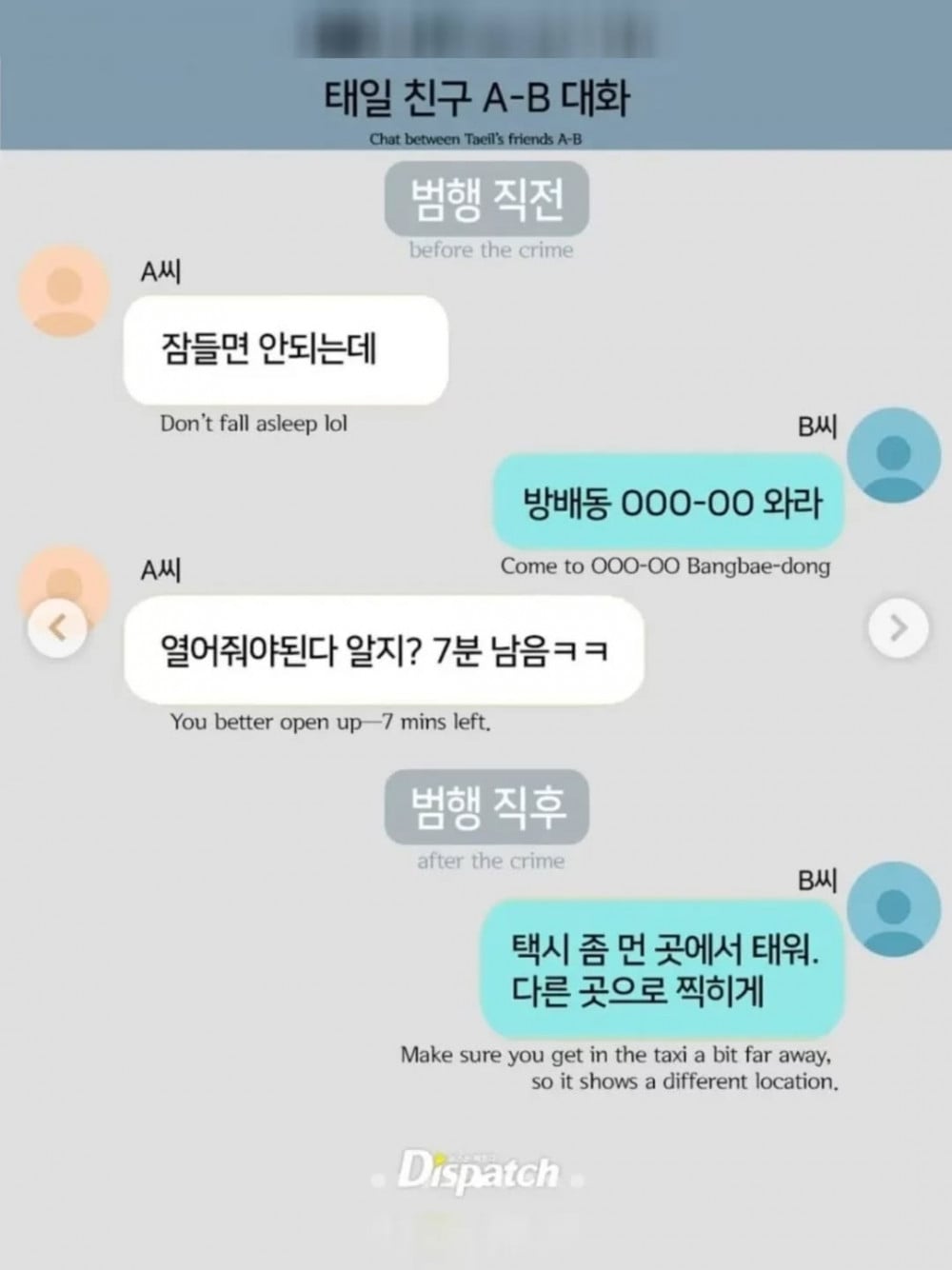 儘管檢方提交了案發當日「A」與「B」之間的通訊紀錄作為證據,三名被告仍否認犯罪是預謀的。這些由「Dispatch」今年稍早獲得的訊息內容如下: