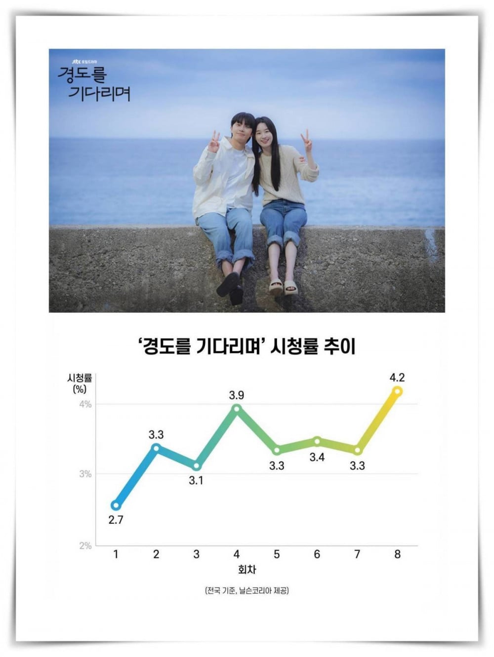 該劇的收視增長並非突然飆升,而是逐步累積。全國收視率從第1集的2.7%升至第2集的3.3%,第4集攀升至3.9%,並在第8集達到4.2%的高峰。在競爭激烈的時段中,該劇保持了穩定的上升趨勢。