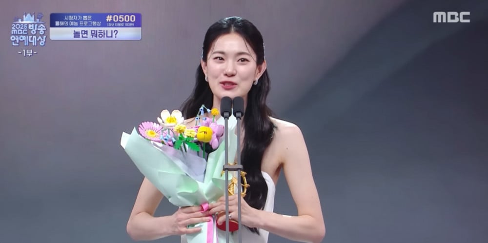 玉子妍在12月29日舉行的「2025 MBC演藝大賞」中獲得最佳藝人獎。她對獲獎顯得相當驚訝,在座位上稍作停留後,向《我獨自生活》的成員們打招呼,然後走上舞台。