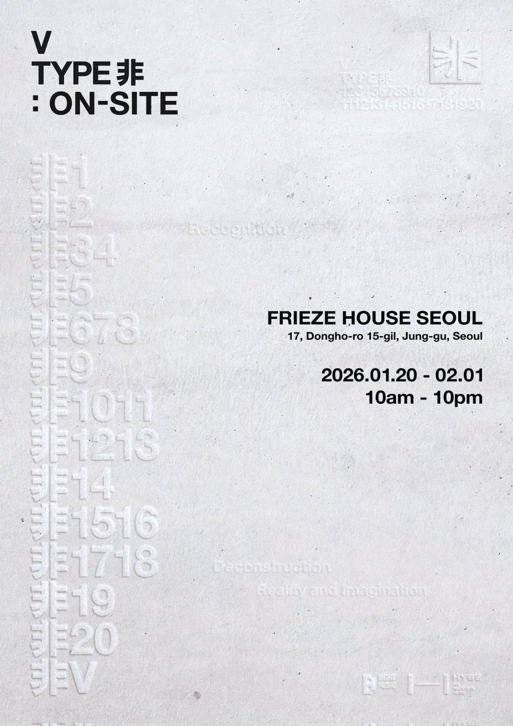 「V TYPE 非 : ON-SITE IN SEOUL」將於一月份在首爾Frieze House舉行,為期約兩週。展覽將設有多個區域,包括展覽區與媒體藝術裝置,旨在讓參觀者能親密地感受藝術家的視角與感性。隨著人們在空間中移動,變換的氛圍將與寫真集的章節節奏同步。