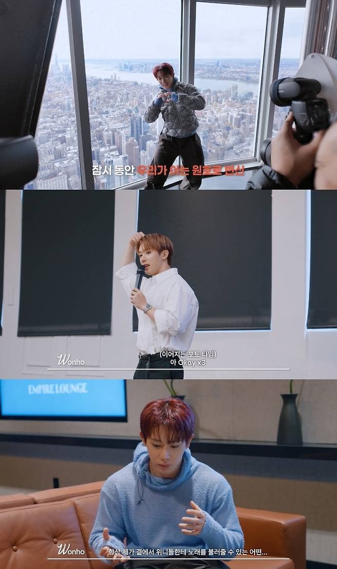 這位藝人也參觀了紐約地標帝國大廈。在102樓觀景台俯瞰城市後,Wonho 注意到沒有韓文標示,並表示他會更加努力,作為一名全球性藝人來代表韓國。