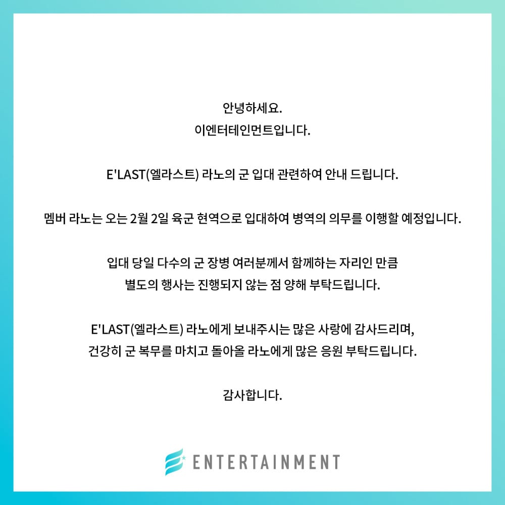 我們想告知各位關於E’LAST成員Rano的入伍事宜。