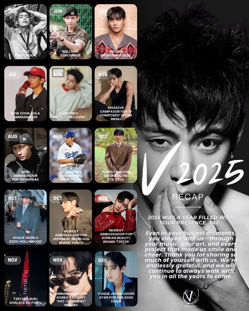 儘管V在2025年有半年時間在履行義務兵役,他仍被《Forbes Korea》評選為其「2025年最具代表性的30位K-pop偶像」榜單中的第一名男偶像,該榜單旨在表彰在國內外均擁有廣泛人氣的偶像。