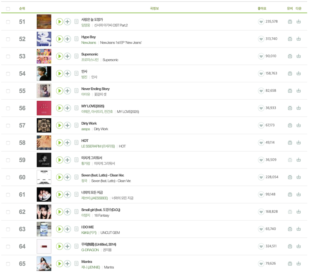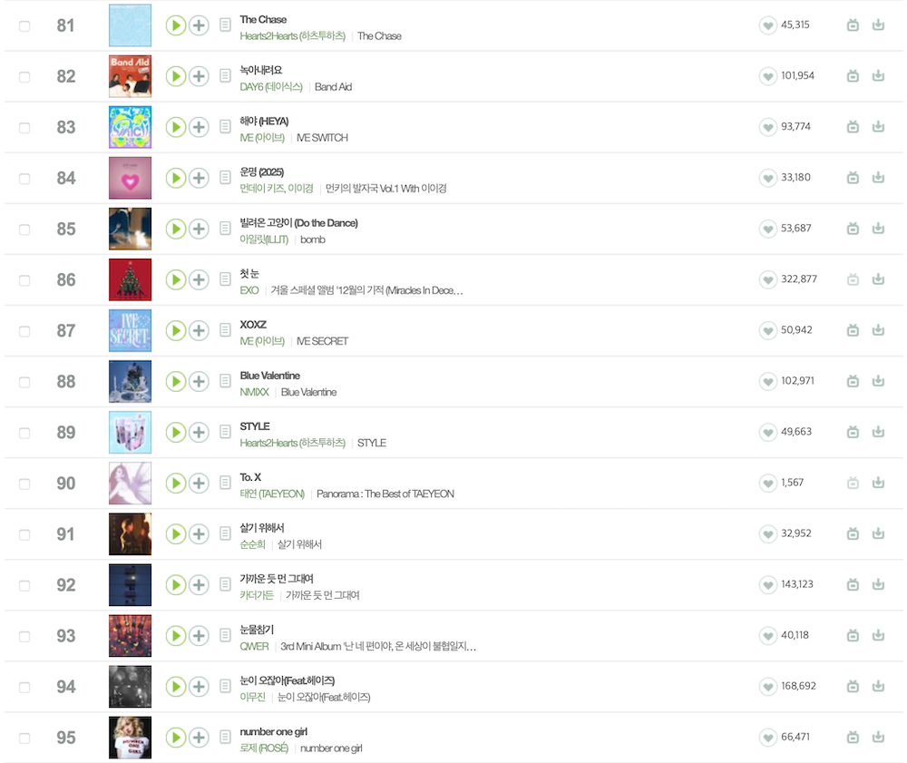 最後,一批新生代藝人也在「2025 年度榜」上留下了印記:BOYNEXTDOOR 的「If I Say, I Love You」佔據了令人矚目的第 12 位;ALLDAY PROJECT 的「Famous」和「Wicked」分別位列第 23 和第 74 位;BABYMONSTER 的「Drip」強勢位列第 28 位;KiiiKiii 憑藉「I Do Me」首次獲得熱門歌曲,排名第 63 位;Hearts2Hearts 則以「The Chase」(第 81 位)和「Style」(第 89 位)展示了他們的崛起勢頭等。