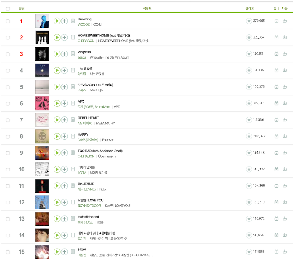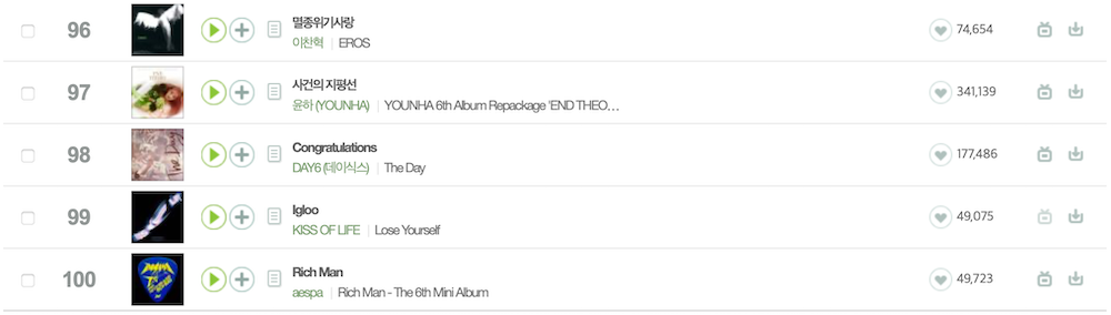 與此同時,aespa 和 DAY6 各有 6 首歌曲進入前 100 名。aespa 憑藉「Whiplash」(第 3 位)、「Supernova」(第 22 位)、Karina 的個人單曲「UP」(第 38 位)、「Dirty Work」(第 57 位)、「Armageddon」(第 73 位)和「Rich Man」(第 100 位)證明了她們在榜單上的實力。而 DAY6 則成功將多首歷久不衰的熱門歌曲打入今年的榜單,例如「Happy」(第 8 位)、「Time of Our Life」(第 17 位)、「Welcome to the Show」(第 20 位)、「You Were Beautiful」(第 25 位)、「Melt Down」(第 82 位)和「Congratulations」(第 98 位)。此外,創作歌手李茂珍亦有 4 首歌曲進入前 100 名。BLACKPINK 成員們的團體及個人作品也在榜單上大放異彩,包括 Rosé 的「APT.」(第 6 位)、Jennie 的「like JENNIE」(第 11 位)、「JUMP」(第 27 位)等。