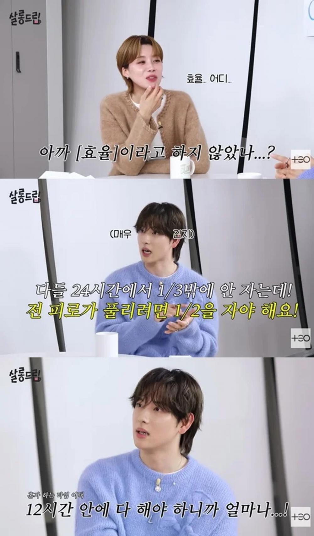 張度練進一步調侃他,將他的睡眠模式比作新生兒,並開玩笑地告訴他要「生活得更勤奮一點。」任時完順著玩笑解釋,睡12小時後,他只剩下12小時來完成所有事情。「我一天只有12小時。如果必須分割使用那12小時,我當然會很忙。」他說。
