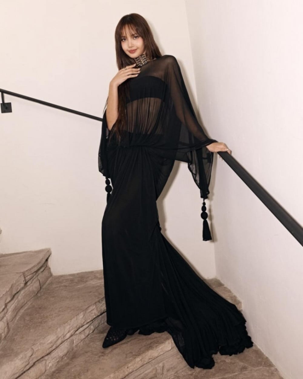 在紅毯上,Lisa 以一襲全黑色透視造型驚豔全場,瞬間成為焦點。她搭配了一條環繞頸部的金色頸鍊,營造出大膽而優雅的氛圍。透視材質突顯了她無瑕的身形曲線,其自信與完美的身材比例再次贏得讚嘆。