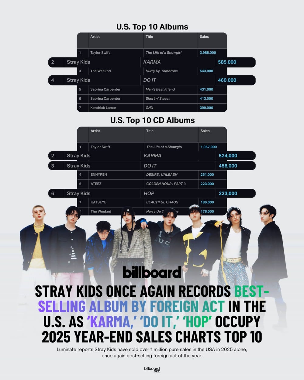 根據 Billboard/Luminate 的數據,Stray Kids 再次證明了他們在美國的巨大人氣,錄得 2025年外國藝人最暢銷專輯 的紀錄。