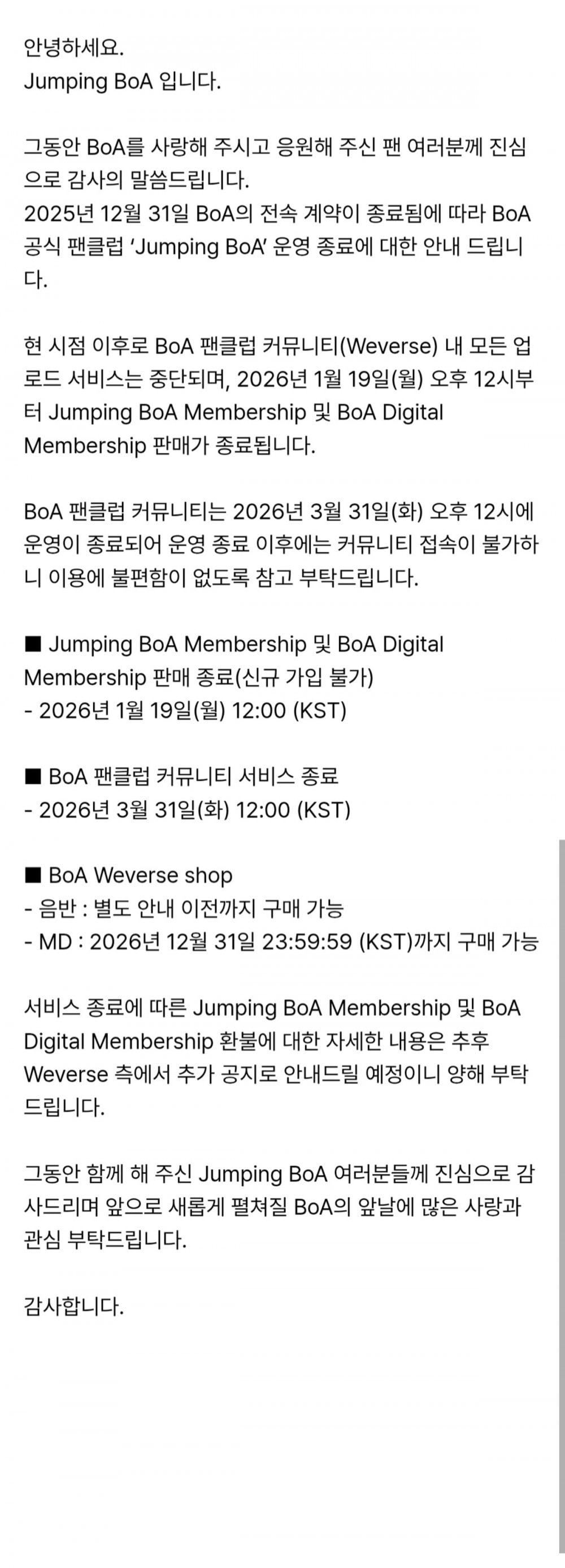 因此,BoA官方歌迷會社群的運作將逐步終止。根據公告,BoA在Weverse上的歌迷會社群內所有已上傳的服務將會停止,而Jumping BoA會籍及BoA數位會籍的銷售將於2026年1月19日韓國時間中午12時正式結束,屆時將不再接受新會員申請。