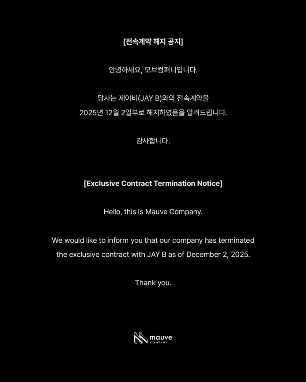12月2日,Mauve Company發布官方聲明,宣布與Jay B的專屬合約已於2025年12月2日終止。該通知以韓文和英文發布,確認此決定已於當日最終確定。