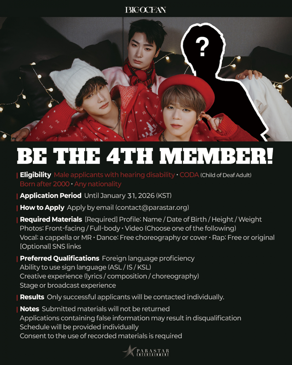 Parastar Entertainment 宣布將舉行全球選拔,為全球首個由聾人及聽障藝術家組成的 K-pop 偶像團體 Big Ocean 招募新成員。