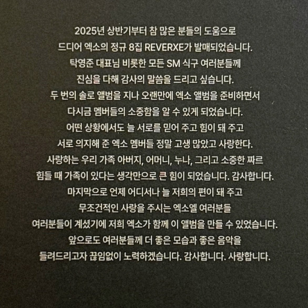 「多虧了從2025年上半年開始許多人的幫助,EXO的第八張正規專輯《REVERXE》終於發行了。我想向Tak Young Jun代表以及SM家族的所有成員表達最深的感謝。