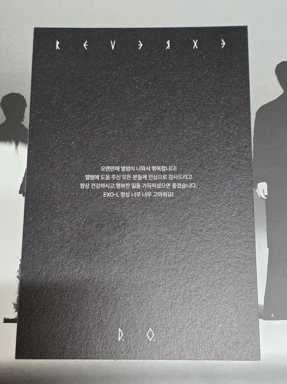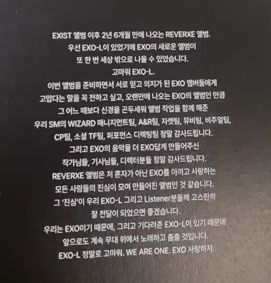 「距離《EXIST》專輯已經過了兩年六個月,現在《REVERXE》終於問世了。最重要的是,這張全新的EXO專輯能夠再次來到這個世界,是因為有EXO-L的存在。謝謝你們,EXO-L。