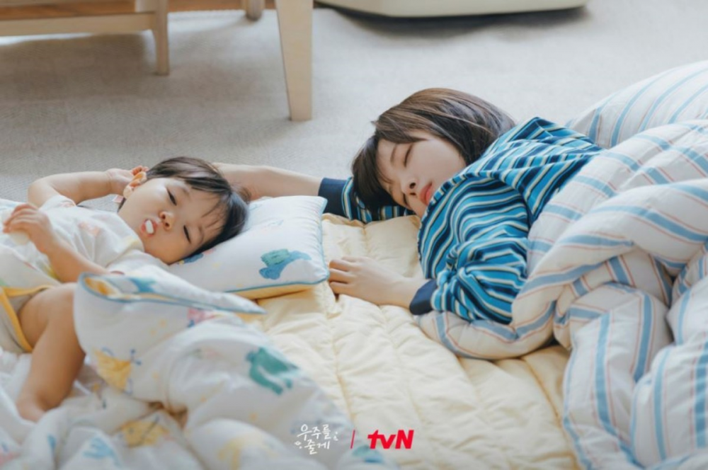 另一張照片則形成對比,顯示賢真在完成育兒工作後因疲憊而睡著,預示著她的日常生活將發生重大轉變——她意外地成為了20個月大的外甥禹柱的監護人。