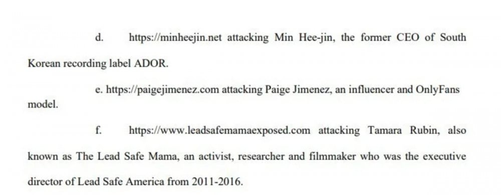 據閔熙珍的代表稱,一個名為'minheejin.net'、疑似針對她的網站,是在美國訴訟的證據開示過程中曝光的。Umhoefer 據報概述了他所描述的「激進公關」活動通常的運作方式,並引用了諸如創建針對特定個人的虛假網站、利用過往訪談分發惡意編輯的影片,以及透過機器人和其他技術工具人為放大負面情緒等方法。