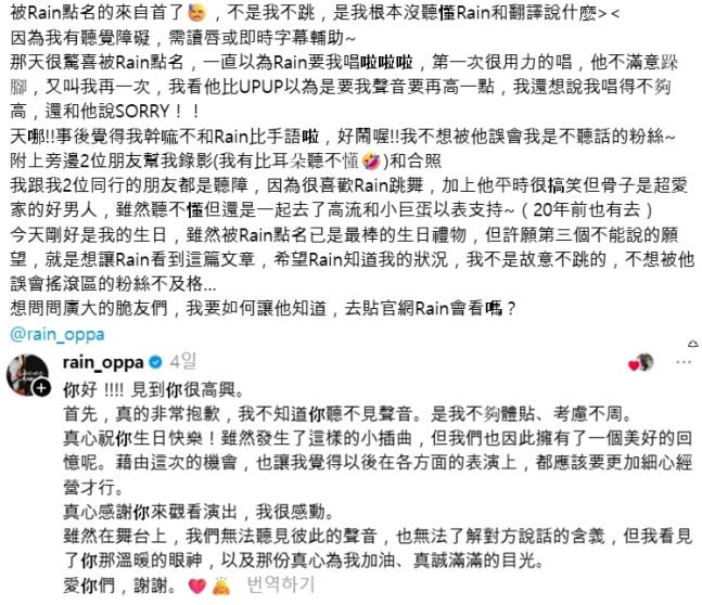2026年1月20日,該粉絲在社交媒體上以中文分享了她的觀點,解釋她無法理解Rain或翻譯的口頭指示。她澄清,作為一名聽障人士,她依賴讀唇或即時字幕。她還提到,她誤以為Rain的手勢是要求她唱大聲點,並表達了擔心藝人可能視她為不合作的粉絲。她補充說,當天演唱會上她的兩位朋友同樣有聽力障礙。