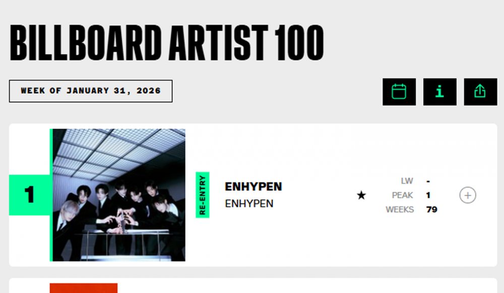 根據Billboard 1月31日的最新榜單,ENHYPEN登上了Artist 100榜單的冠軍位置。該排名是通過對數位歌曲和專輯銷量、線上串流媒體播放量、電台播放量以及社群媒體參與度進行綜合分析後確定的。