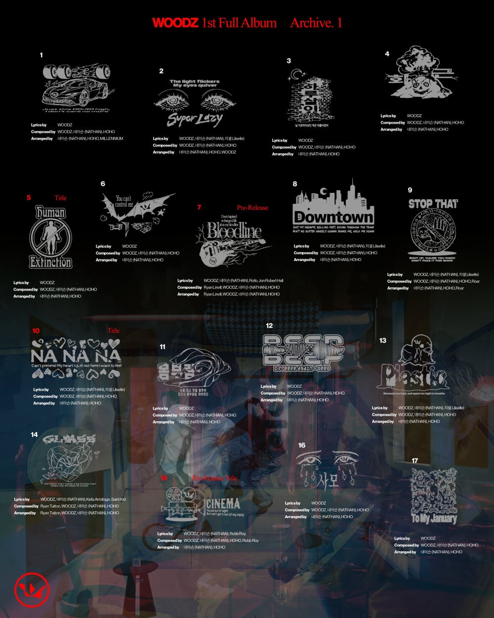 韓國時間2月6日凌晨,WOODZ公開了收錄於其首張正規專輯的所有曲目名稱。根據最新歌單,WOODZ將透過這張專輯發行17首歌曲。包括 「Super Lazy」、「Firefly」、「Hot」、「Human Extinction」、 「Fly」、 「Bloodline」、「Downtown」、「Stop That」、「Na Na Na」、 「Struggle」、「Beep」、「Plastic」、 「Glass」、 「Cinema」、「Samo」以及「To My January」。