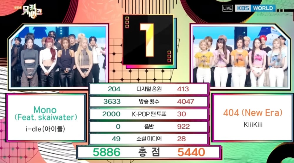 i-dle 的《Mono》總共獲得5,886分,成功奪得當晚第一名。緊隨其後的是KiiiKiii 的《404 (New Era)》,獲得5,440分,排名第二。 在獲獎感言中,i-dle 表示:「我們很開心也很感謝能夠因為Neverland而獲得第一名。我們會繼續努力,作為i-dle 活躍下去。」