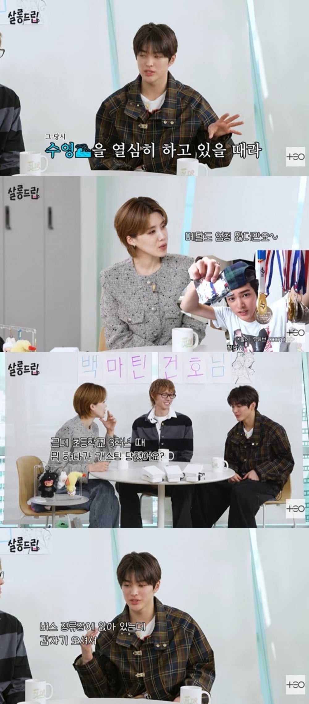 當張度練問道:「那和你單純游泳的路不是完全不同嗎?」建昊回答:「所以我才跟姐姐學跳舞。她跳芭蕾,也跳很多放送舞蹈。我學的第一首歌是《江南Style》。後來是《Dynamite》。」他強調了姐姐的影響。