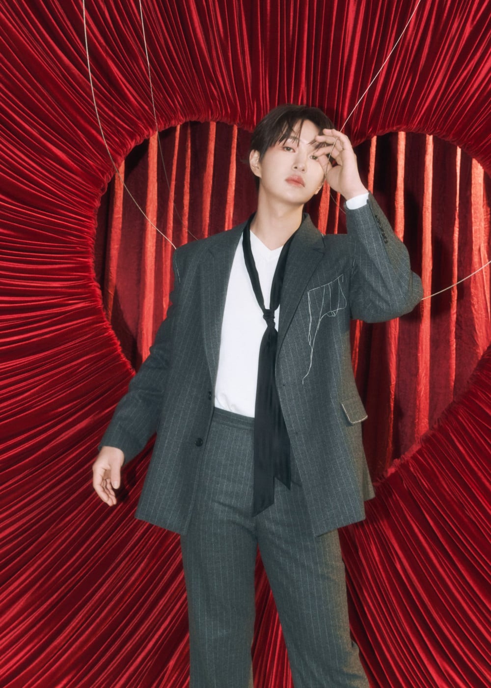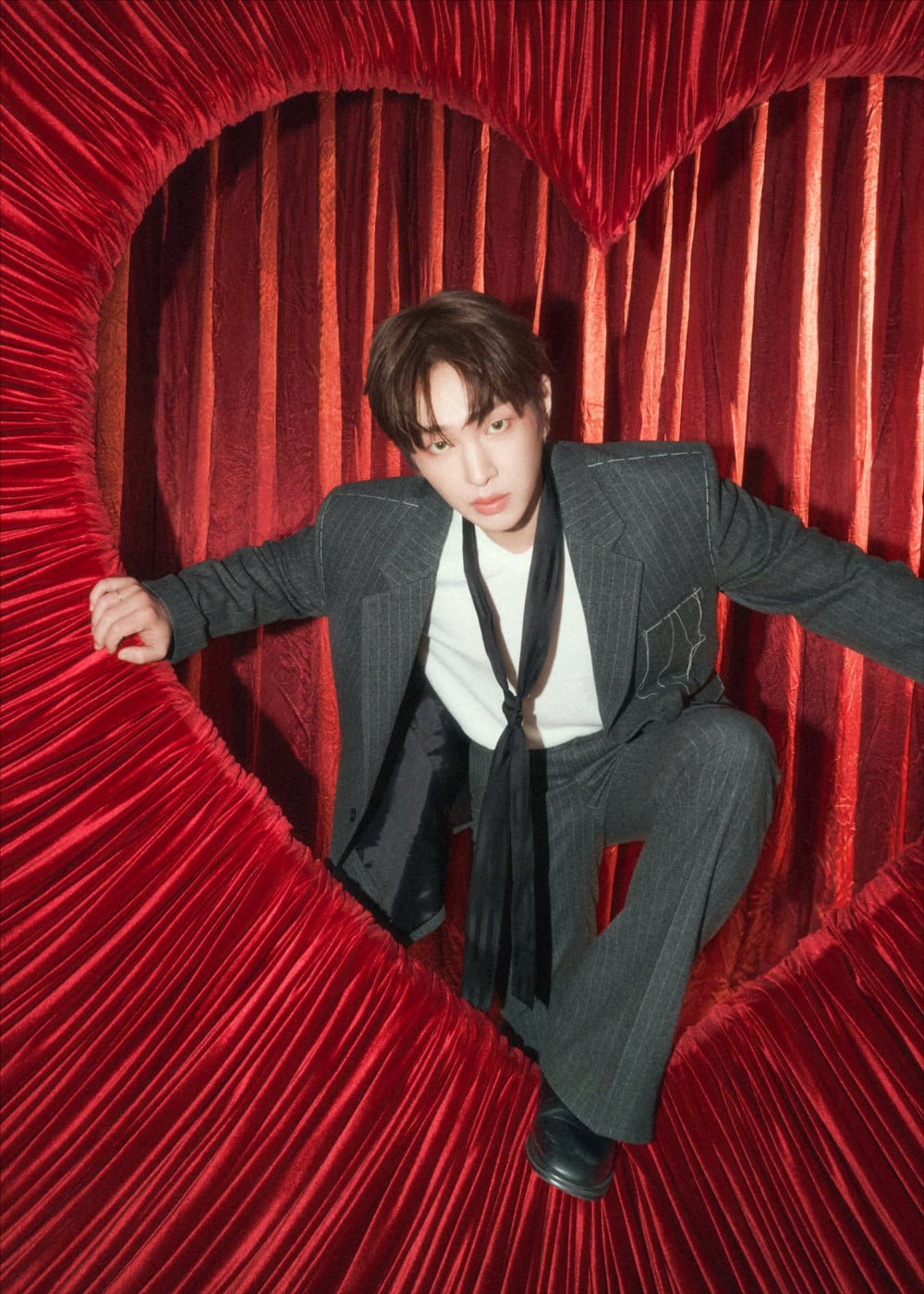 在行程表之後,ONEW 公開了一組型格照片,他身穿灰色西裝搭配黑色領帶,背景是醒目的紅色心形圖案。