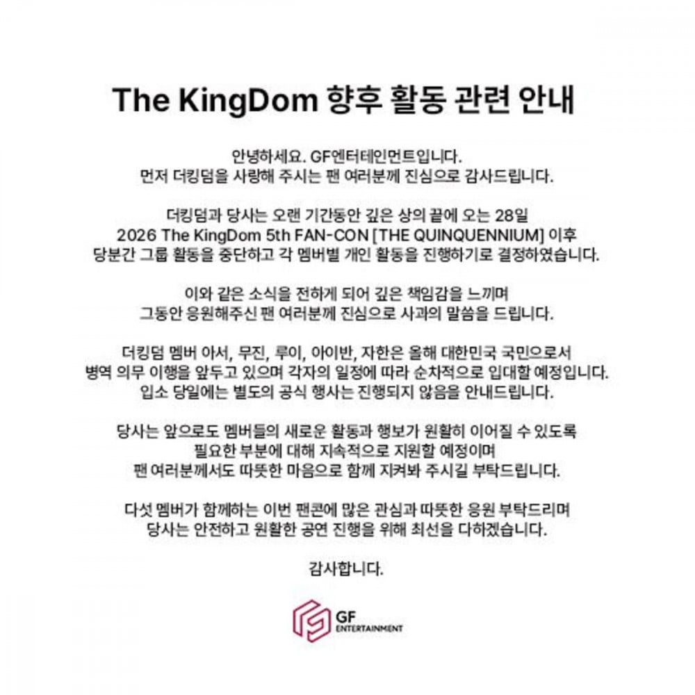 2月12日,經紀公司發布了一份標題為「關於The KingDom未來活動的通知」的官方聲明,向粉絲們一直以來的愛與支持表達誠摯感謝。聲明指出,在團體於2月28日舉行的第五場粉絲演唱會——[2026 The KingDom 5th FAN-CON ‘THE QUINQUENNIUM’]——之後,團體將暫時停止全員活動,並專注於個人行程。