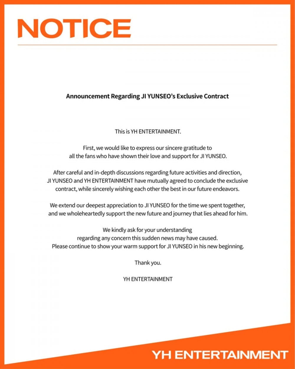 2月13日,YH娛樂發布聲明,宣布公司與池潤瑞經過協商,決定終止專屬合約。
