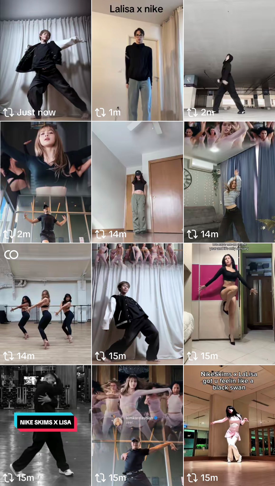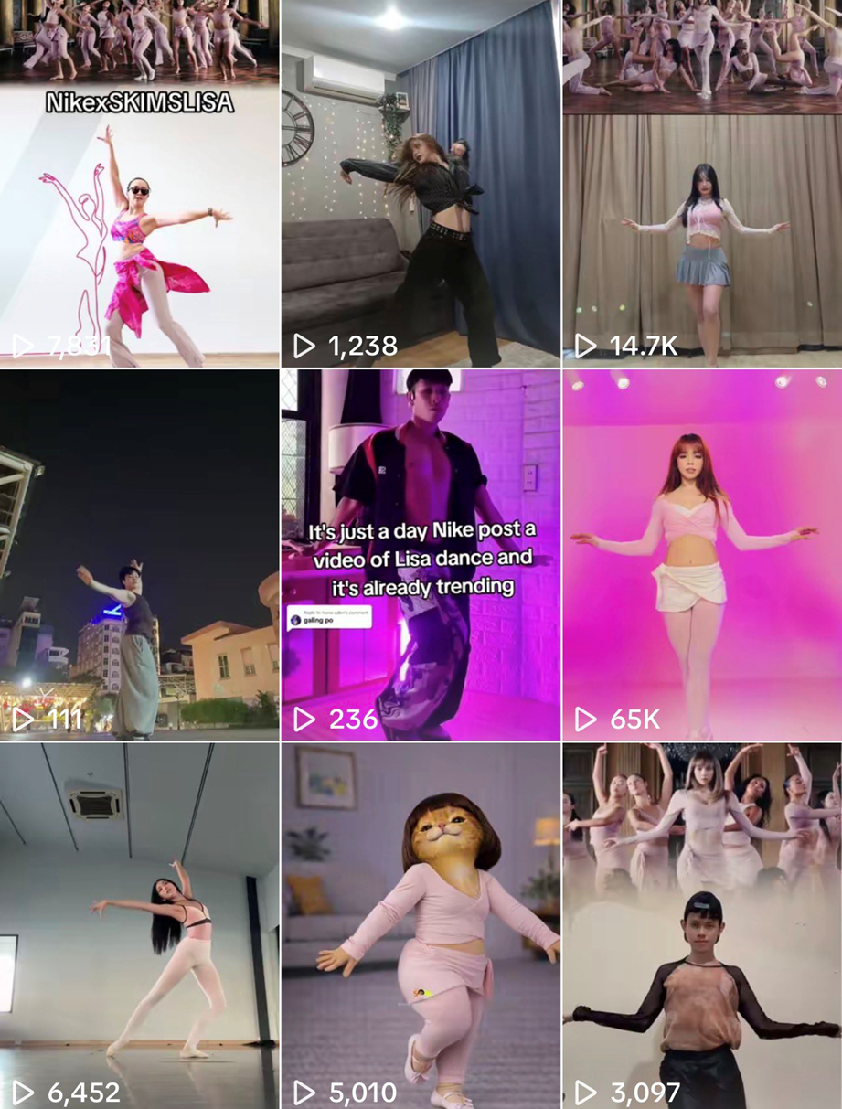 在社交媒體世界裡,這項由 Lisa 主演的舞蹈影片大力宣傳的活動同樣受歡迎,一則 NIKExSKIMS 貼文在創紀錄的時間內獲得了超過 670 萬次觀看和超過 100 萬個讚。不僅如此,這則廣告在 TikTok 上瘋傳,產生了巨大的觀看次數,並引發了病毒式舞蹈熱潮,平台上出現了超過 617 則貼文,來自不同國家的用戶通過模仿 Lisa 的時尚舞步來展示他們的舞蹈技巧。