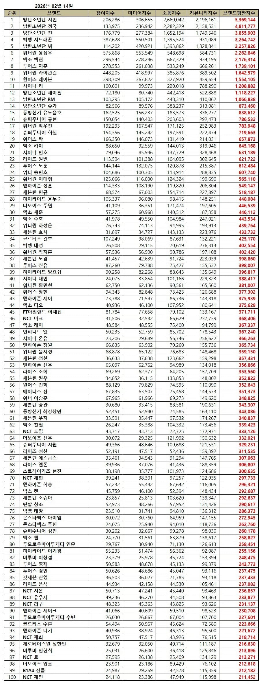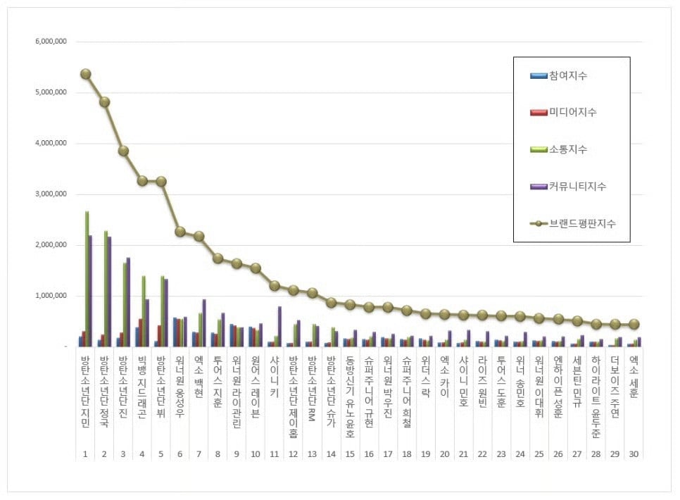 從1月14日至2月14日(韓國標準時間),韓國品牌聲譽指數分析了755位個人男K-Pop偶像在消費者參與度、媒體活動、溝通及社區活動等方面的大數據。根據分析結果,Jimin連續第三個月位居榜首,本月共獲得5,369,144品牌指數。Jungkook連續第二個月位居第2位,獲得4,811,777品牌指數,緊隨其後的是Jin,以3,855,903品牌指數位居第3位。