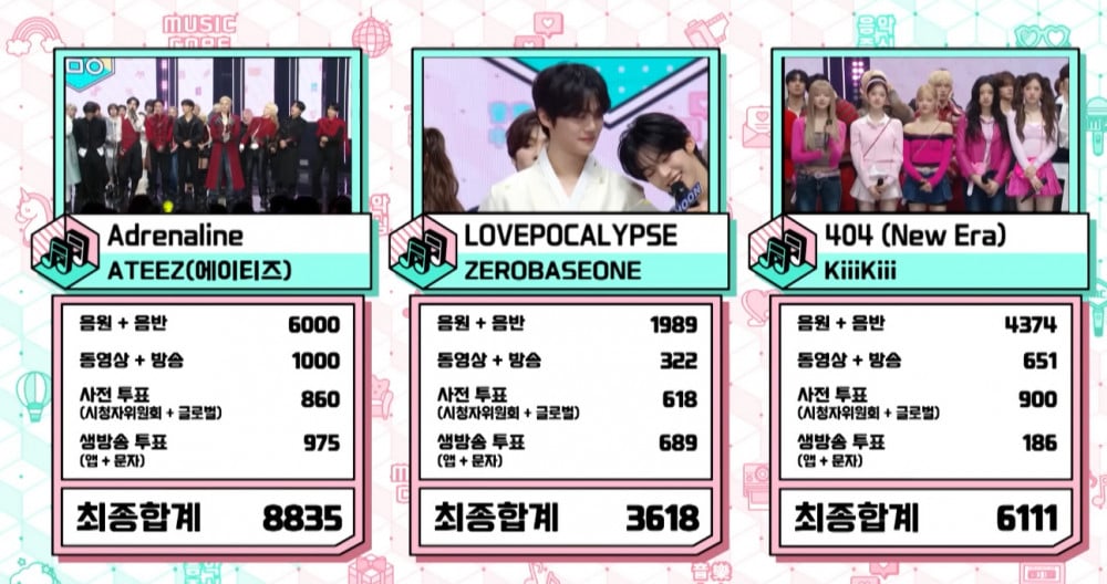 在2月14日播出的MBC 《Show! Music Core》中,ATEEZ、ZEROBASEONE 和 KiiiKiii 入圍了二月第二週的一位候補。ZEROBASEONE 的《LOVEPOCALYPSE》以3,618分獲得第三名。KiiiKiii 的《404 (New Era)》以6,111分排名第二。ATEEZ 則憑藉《Adrenaline》以8,835分奪得一位,為該曲目拿下第二個冠軍。