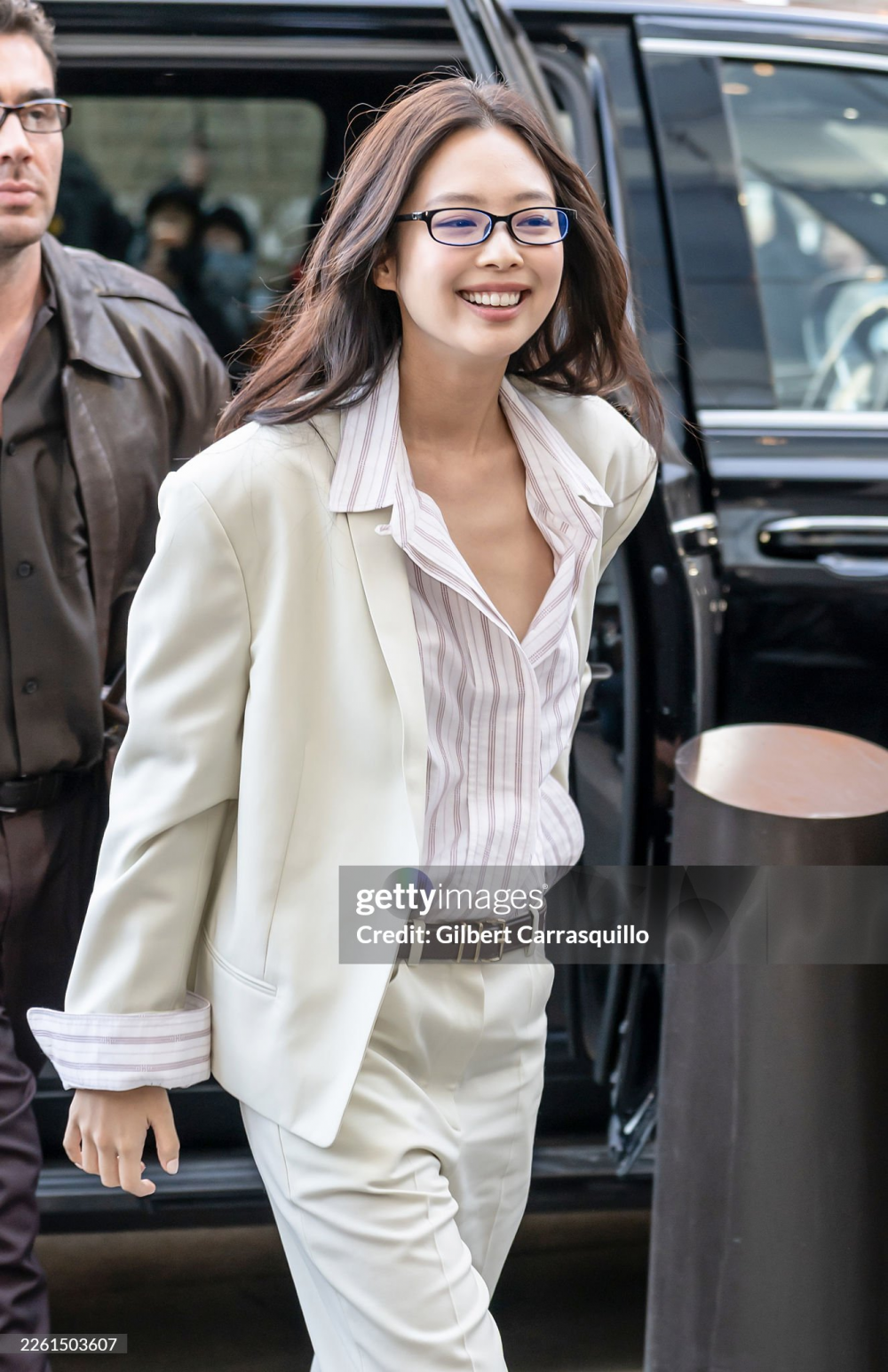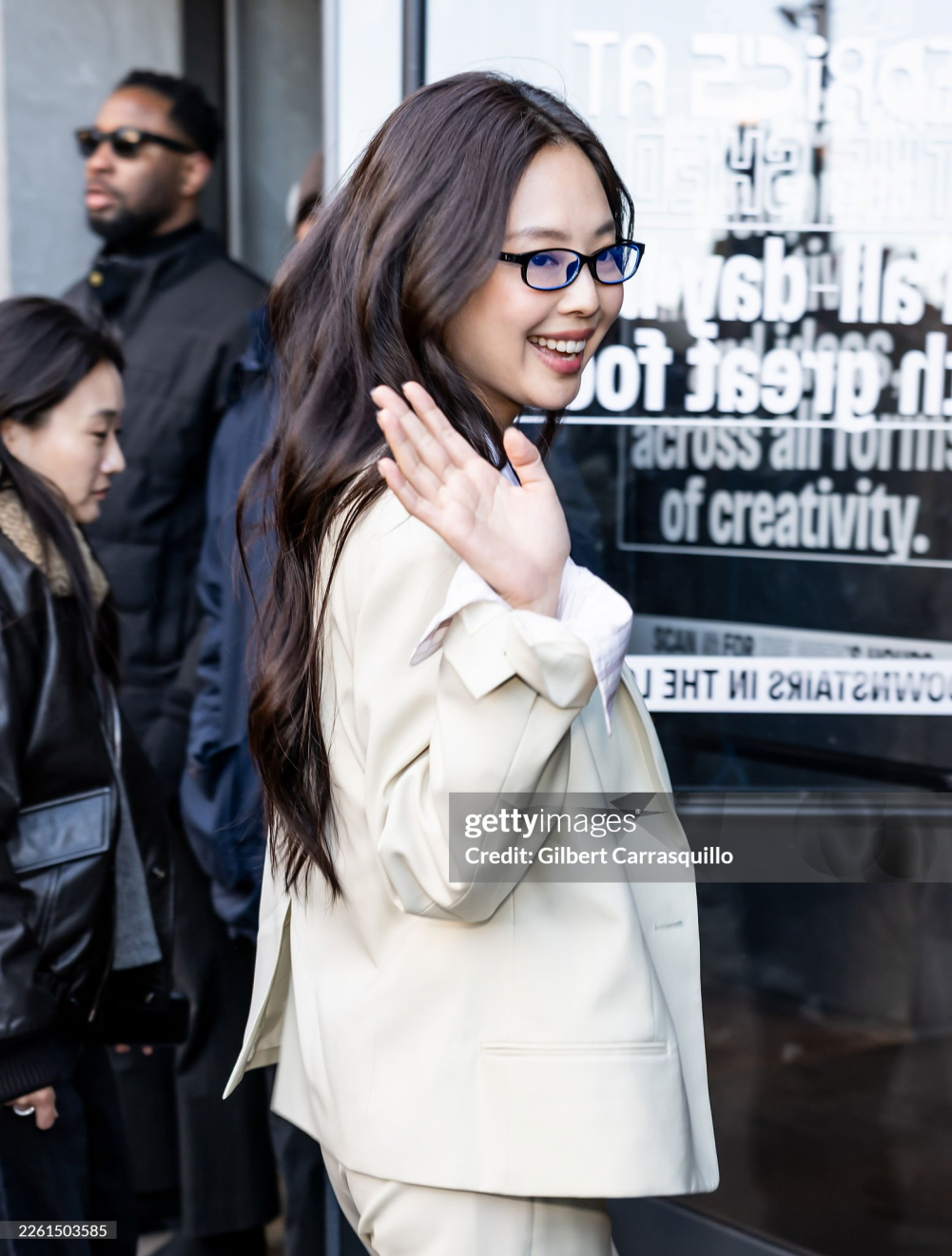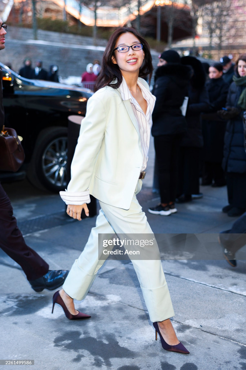 2月14日,Jennie現身紐約Calvin Klein時裝展。她以一身優雅的象牙色西裝搭配條紋襯衫及眼鏡亮相,登場時已令人留下深刻印象。其自然風格的髮型與妝容,更突顯了這套特別訂製服裝的細節。